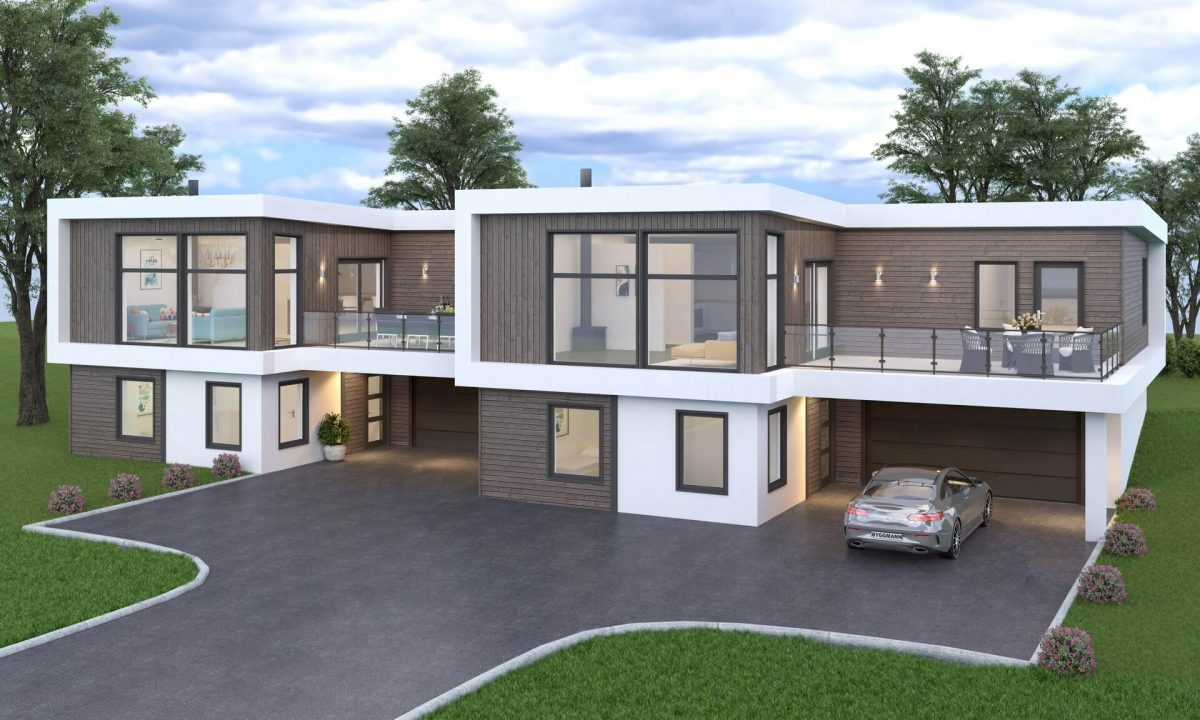 Bolig 1104 er en tomannsbolig litt utenom det vanlige. Materialene har blir satt sammen for å skape en spennende fasade. Boligen er beregnet for skrå utsiktstomter og enhetene har blant annet en integrert romslig garasje. Fra kjøkkenet har man direktetilgang til terreng på ene siden av bygget, mens man fra soverom og stue har tilgang til terrasse.