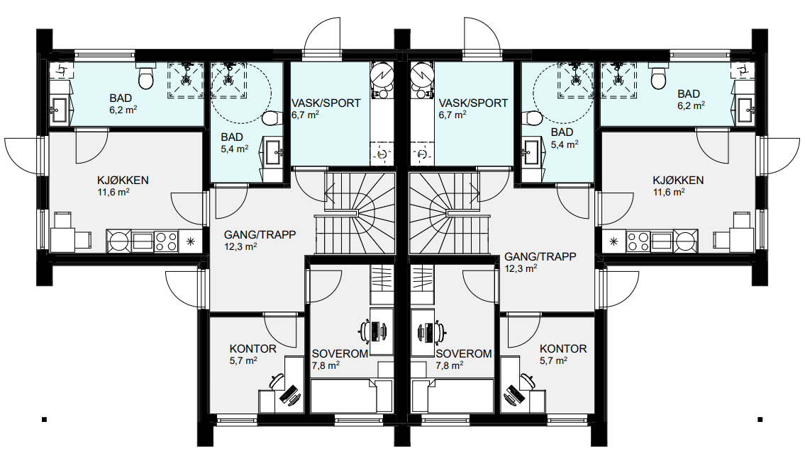 Denne stilrene og moderne tomannsboligen har to identiske boenheter med fire soverom, to bad og et kontor. I tillegg har boligen et praktisk vaskerom med egen utgang. I boligens andre etasje finner du en stor og romslig stue-/kjøkkensone, perfekt for deg som vil samle familie og venner. Herfra kan du også ta deg ut på boligens altan.