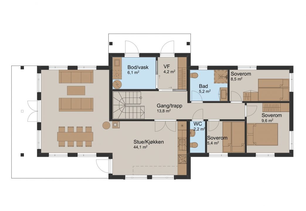 Hytten er tilpasset flate tomter og har alle fasiliteter samlet på hovedplanet. Med fem soverom kan du huse både venner og familie, med sine nesten 150m2 er