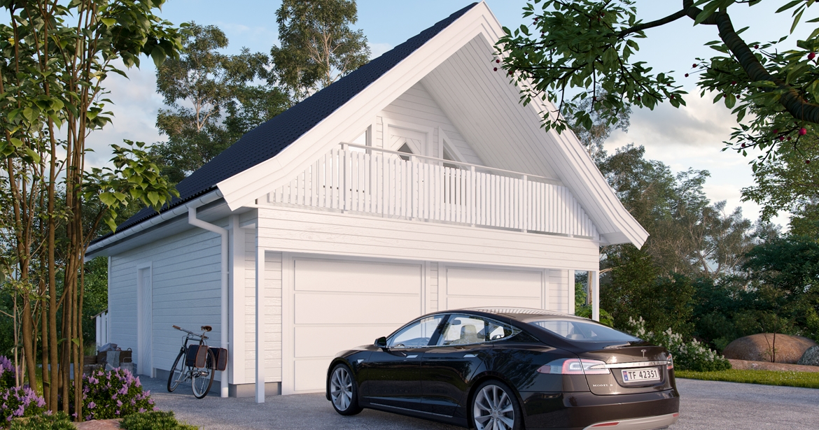 Garasjen inneholder et garasjerom i første etasje med en fradelt bod i bakkant av rommet. Garasjen har to garasjeporter, en praktisk dør i bakkant og vinduer for godt lysinnslipp.